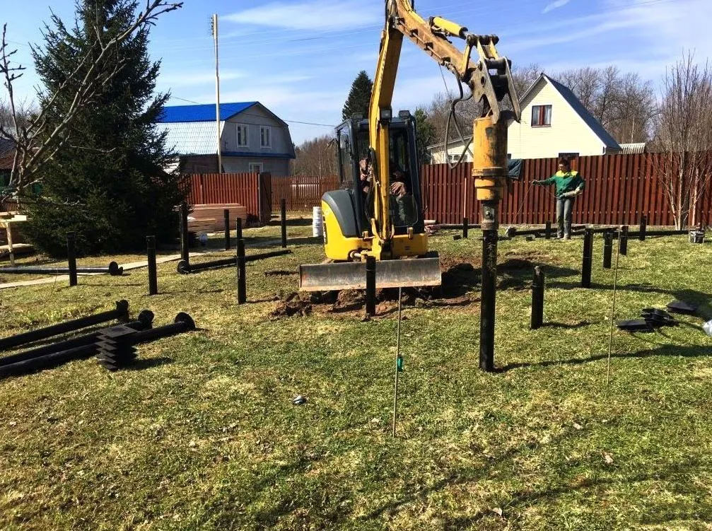 Монтаж фундамента на сваях занимает 1-2 дня. После установки основания не нужно ждать затвердевания и усадки, как в случае с бетонным фундаментом.